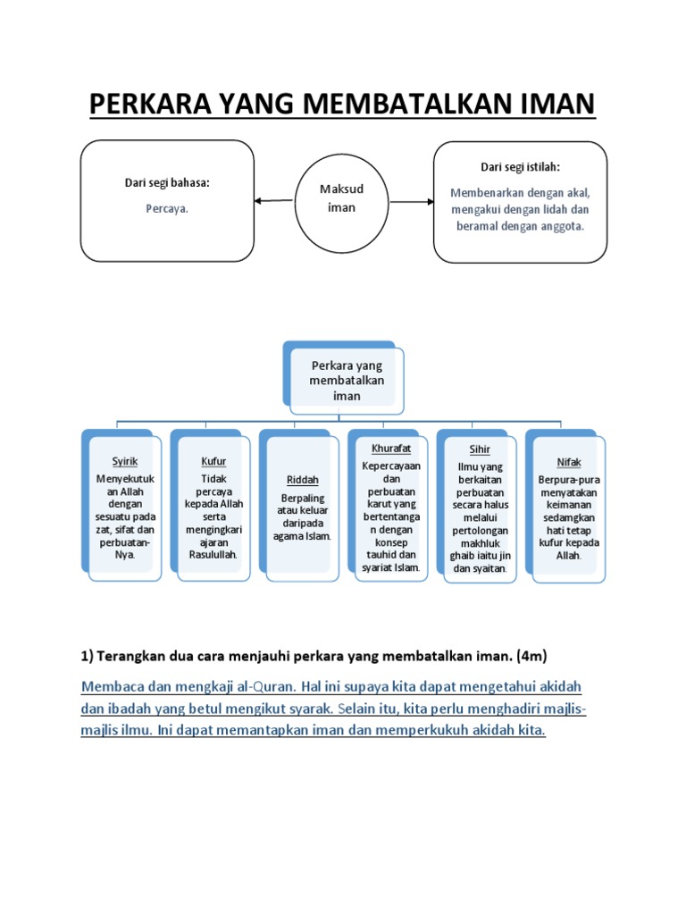 Sebab sikap tersebut menunjukkan lemahnya iman seseorang. A Perkara yang mendekatkan diri kepada Allah SWT b Perkara yang mengurangkan Iman c Perkara yang membatalkan iman d Ciri - ciri yang merosakkan Iman 12 Antara berikut yang manakah bukan kesan iman dalam kehidupan pelajar. Penyenaraian yang dibuat oleh para ulamak terhadap perkara-perkara yang membatalkan aqidah ada yang menyenaraikan 10 20 bahkan 40 perkara dan sebagainya adalah bertitik tolak dari kaedah asas ini.